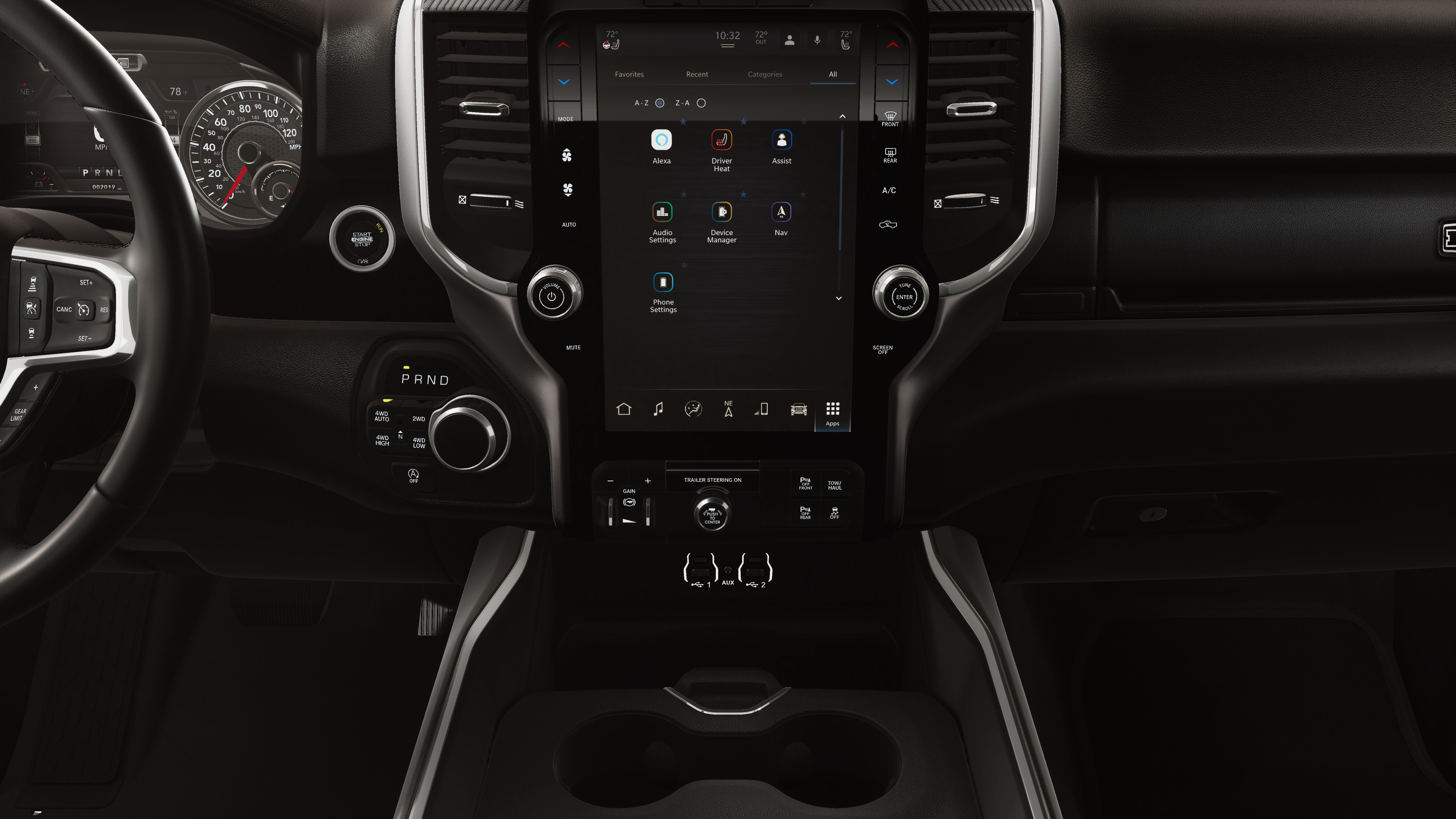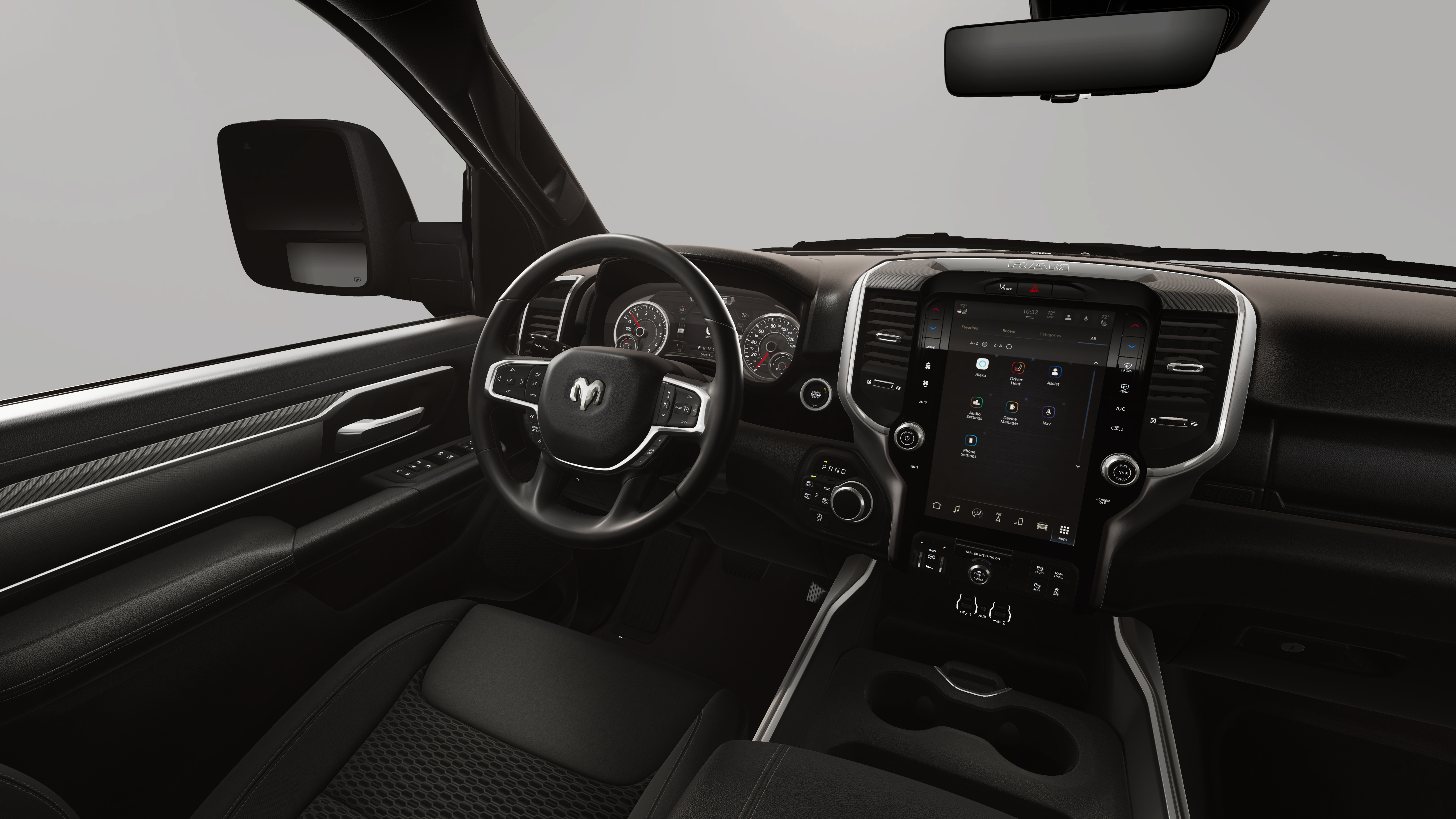 BIG HORN LEVEL 2 EQUIPMENT GROUP SiriusXM Radio Service, Power Adjustable Pedals, Leather Wrapped Steering Wheel, 12 Touchscreen Display, Glove Box Lamp, Auto Power-Folding Mirrors, 115V Auxiliary Rear Power Outlet, Media Hub w/2 Charge Only USBs, Heated Front Seats, Security Alarm, Black Premium Power Mirrors, Premium Overhead Console, 9 Amplified Speakers w/Subwoofer, Disassociated Touchscreen Display, Body Color Fender Flares, Remote Tailgate Release, 115V Auxiliary Power Outlet, LED Dome Lamp w/On/Off Switch, Universal Garage Door Opener, 2nd Row In Floor Storage Bins, Sun Visors w/Illuminated Vanity Mirrors, LED Footwell Lighting, Rear Window Defroster, Rear View Auto Dim Mirror, Rear Power Sliding Window, GPS Navigation, Overhead LED Lamps, Wheels: 20 x 9 Aluminum Chrome Clad, ENGINE: 3.0L I6 HURRICANE SO TWIN TURBO ESS Aux Battery, 700 Amp Maintenance Free Battery, Active Noise Control System, GVWR: 7,100 lbs, 3.55 Rear Axle Ratio, Dual Rear Exhaust w/Bright Tips, Start-Stop Dual Battery System, 230 Amp Alternator, NIGHT EDITION Tires: 275/55R20 OWL All Season, Bridgestone Brand Tires, Accent Color Premium Power Mirrors, Exterior Mirrors w/Supplemental Signals, Black Headlamp Bezels, Exterior Mirrors Courtesy Lamps, Grille Black Surround Black Mesh, Auto Power-Folding Mirrors, Wheels: 20 x 9.0 Aluminum Painted Clad, Auto Dim Exterior Driver Mirror, Black Exterior Truck Badging, Anti-Spin Differential Rear Axle, Accent Color Door Handles, Accent Color Tailgate Handle, Black Interior Accents, Dual Exhaust w/Black Tips, Body Color Front Bumper, Body Color Rear Bumper w/Step Pads, Black Tail Lamp Bezels, RAM Grille Badge - Black, Black Painted Exterior Mirrors Caps, SURROUND VIEW CAMERA SYSTEM 12-Way/1-Way Trailer Connector, TRANSMISSION: 8-SPEED AUTOMATIC (8HP75).