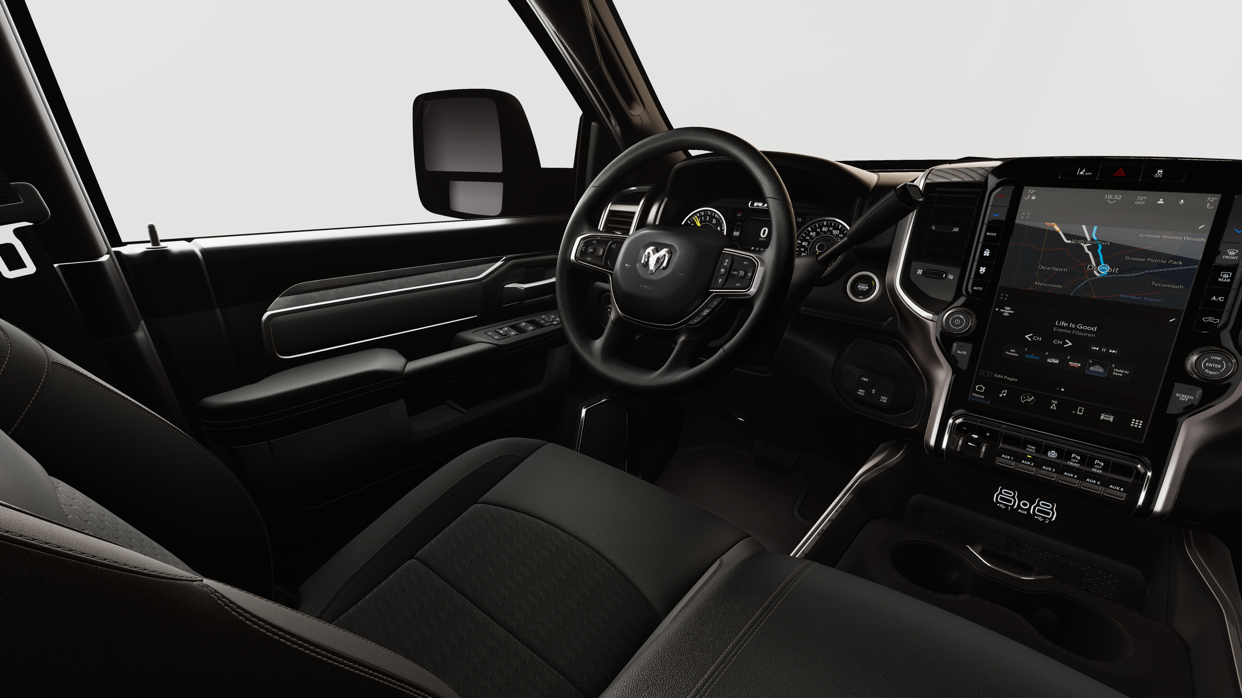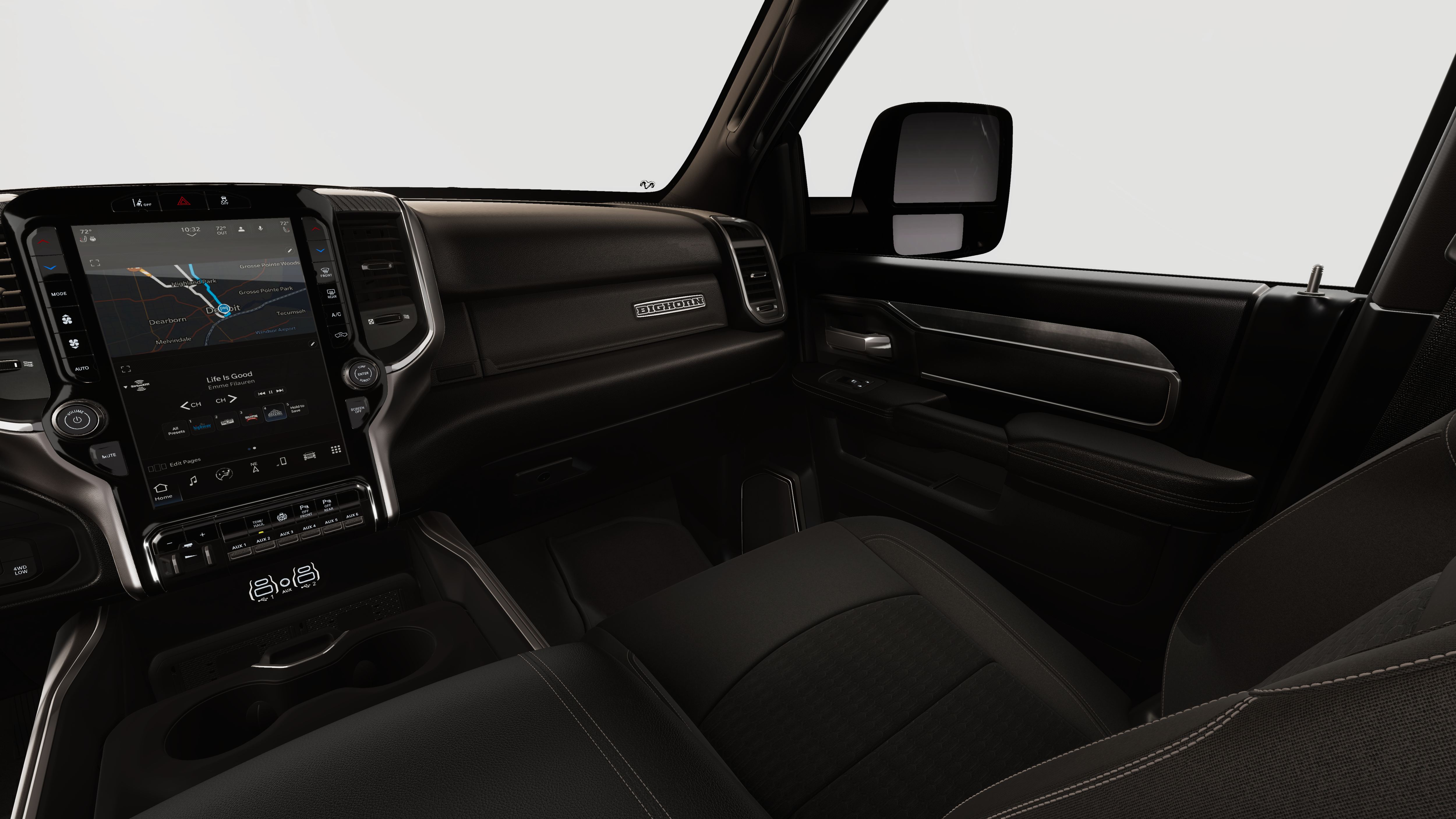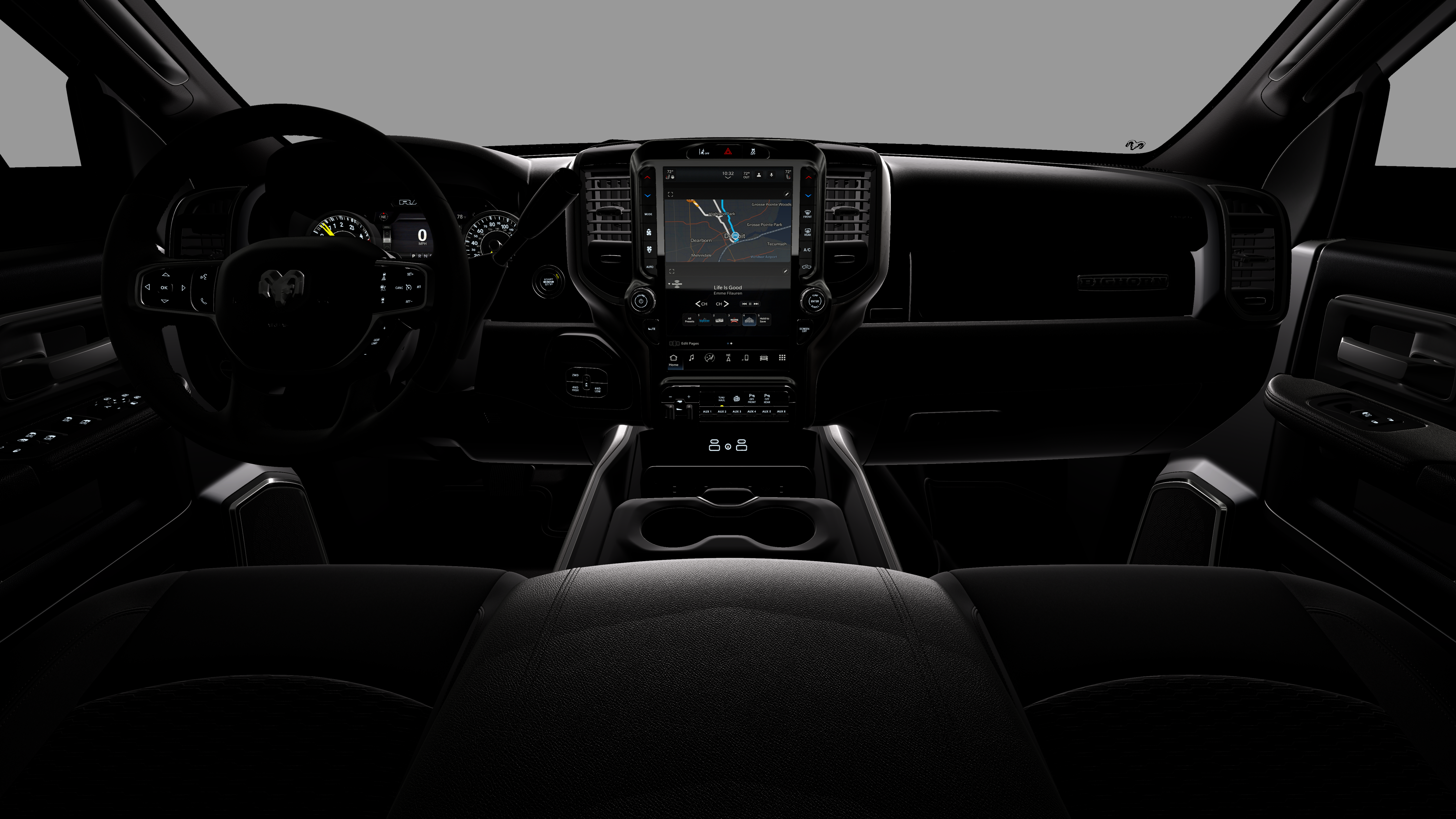 4x4, iPod/MP3 Input, CD Player, Trailer Hitch, Keyless Start. Ram Big Horn with Ceramic Gray Clearcoat exterior and Black interior features a Straight 6 Cylinder Engine with 430 HP at 2800 RPM*.